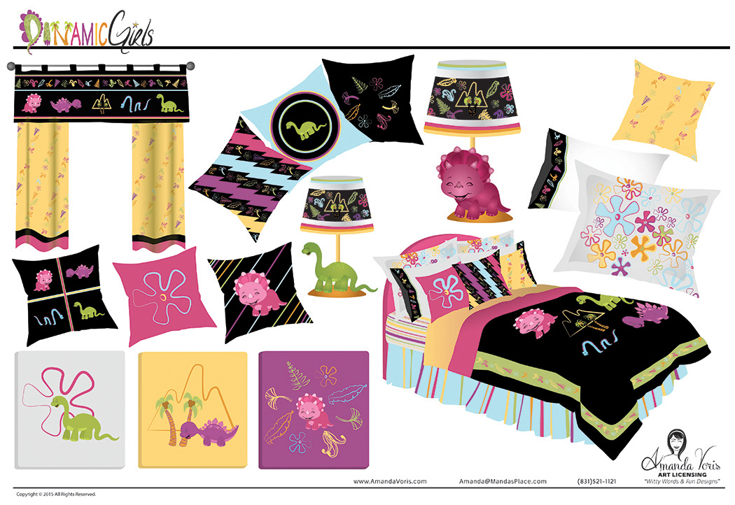 Dinamic Girls is a dinosaur pattern collection just for girls! Now girls who love dinosaurs too can finally have a bedding collection, wall art, lamps and more! Available for Licensing www.amandavoris.com