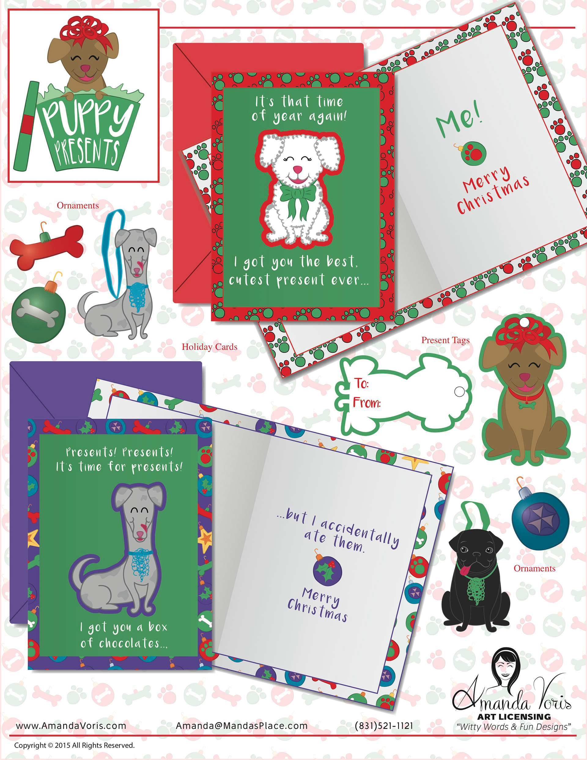 Puppy Presents is a Christmas consumer product collection. It features a fun color palette that is not only green and red but with accents of purple and blue. This collection is perfect for wrapping paper, oniments, coffee cups and many other holiday decorations.
